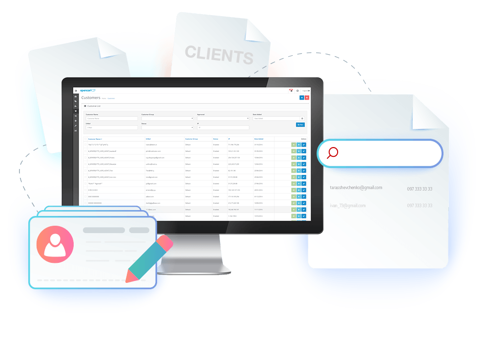 Find the necessary client by name, cell phone or email. Every client , who placed the order, goes to the shop database.